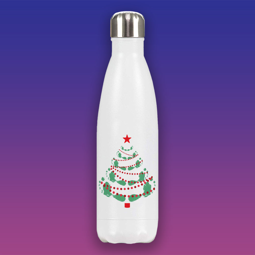 Fel rhan o'n casgliad 'Tymor y Gwyliau', mae'r dyluniad hardd hwn yn cynnwys olion traed y babanod efeilliaid Seren a Rowan, a aned 2 fis yn gynnar ac a dderbyniodd laeth rhoddwr gan y Human Milk Foundation yn NICU. Mae'r olion traed yn ffurfio coeden Nadolig, ynghyd â baubles a seren ar y brig!
